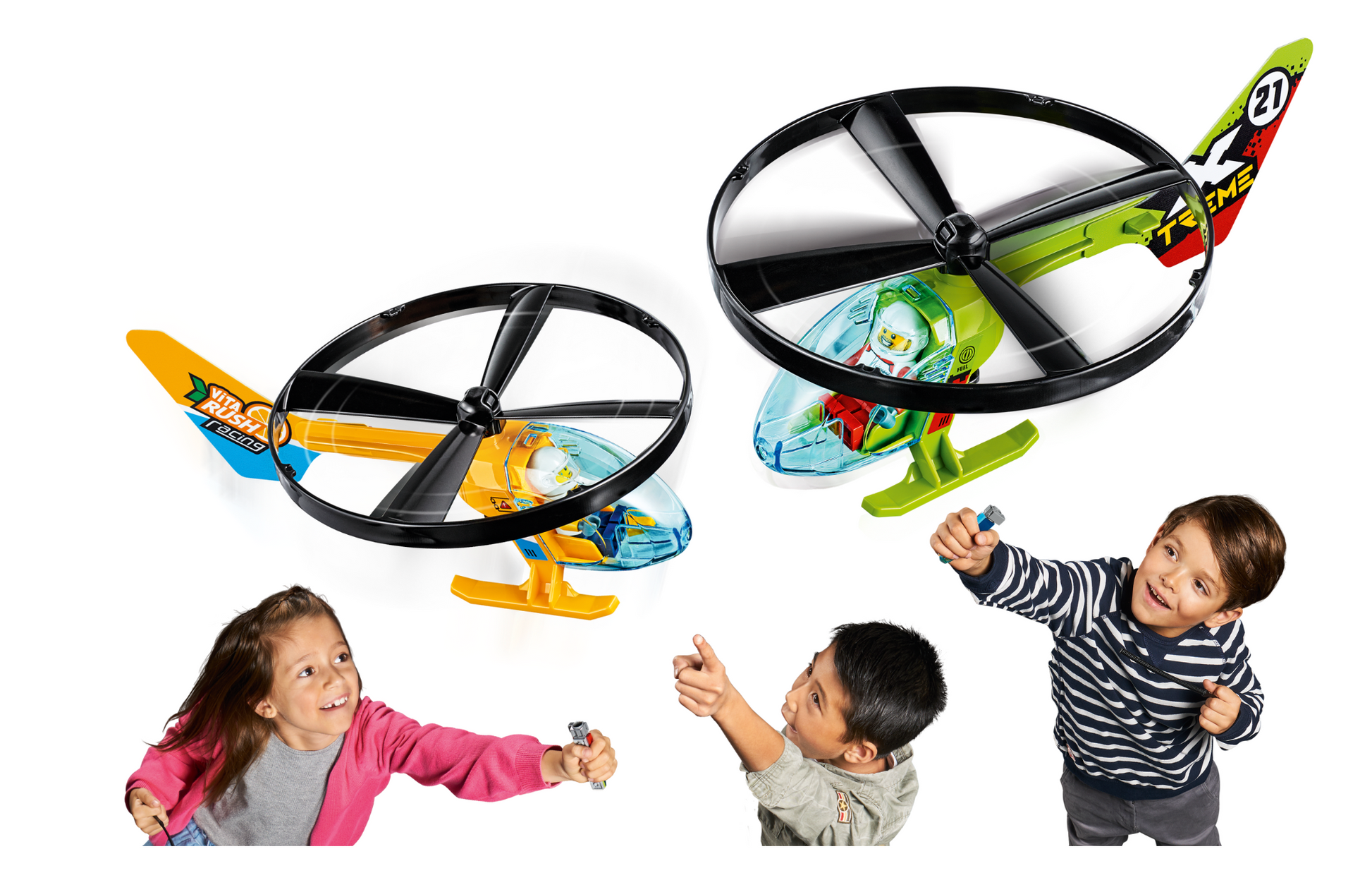 • Stunt plane toy measures over 3" (8cm) high, 7" (20cm) long and 7" (20cm) wide, while each ripcord helicopter measures over 2" (7cm) high, 7" (18cm) long and 4" (12cm) wide.