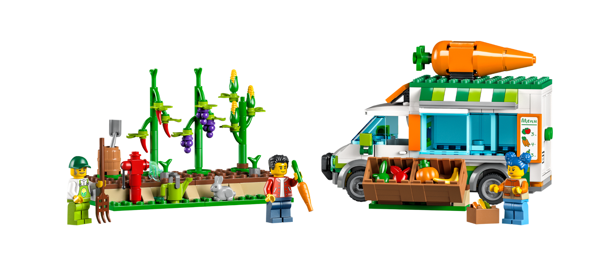 • Fun functions – The Farmers Market Van comes with a serving window, opening side doors, rear doors and a minifigure cab, while the veggie patch features a fun carrot-growing function