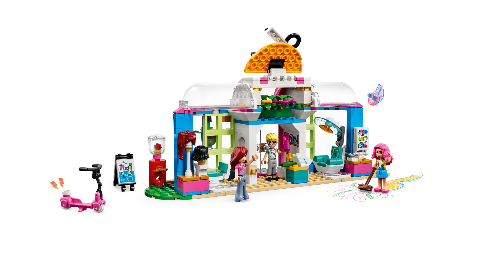 • 3 mini-dolls – The set comes with LEGO® Friends characters Paisley, Olly and Nadia, the hair salon building with its detailed interior and exterior, plus Olly’s scooter and a park bench