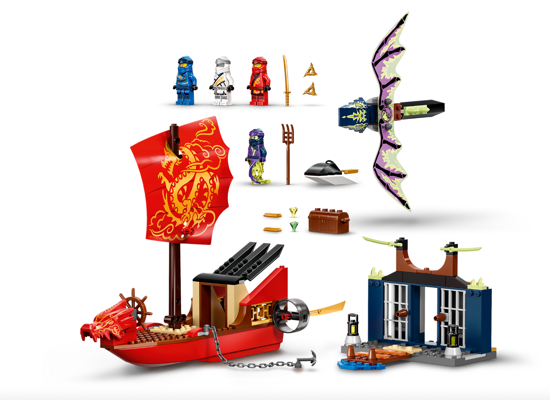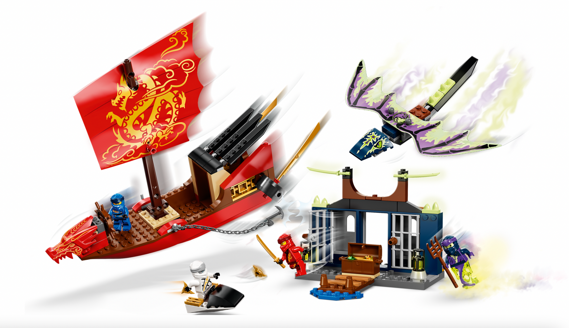 • LEGO® NINJAGO® Final Flight of Destiny’s Bounty (71749) introduces youngsters to building before they recreate ninja stories with this LEGO ship playset crammed with exciting features.