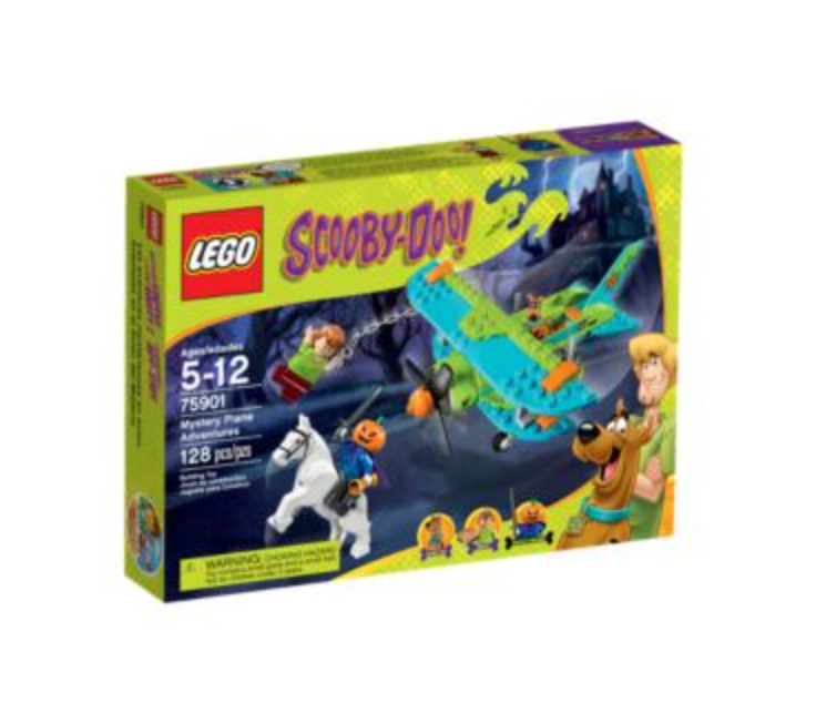 LEGO 75901 Mystery Plane Adventures was a 128 piece Scooby-Doo set with 2 minifigs released in 2015. It includes a lime green and bright blue biplane and Scooby-Doo, Shaggy, and the Headless Horseman minifigures.