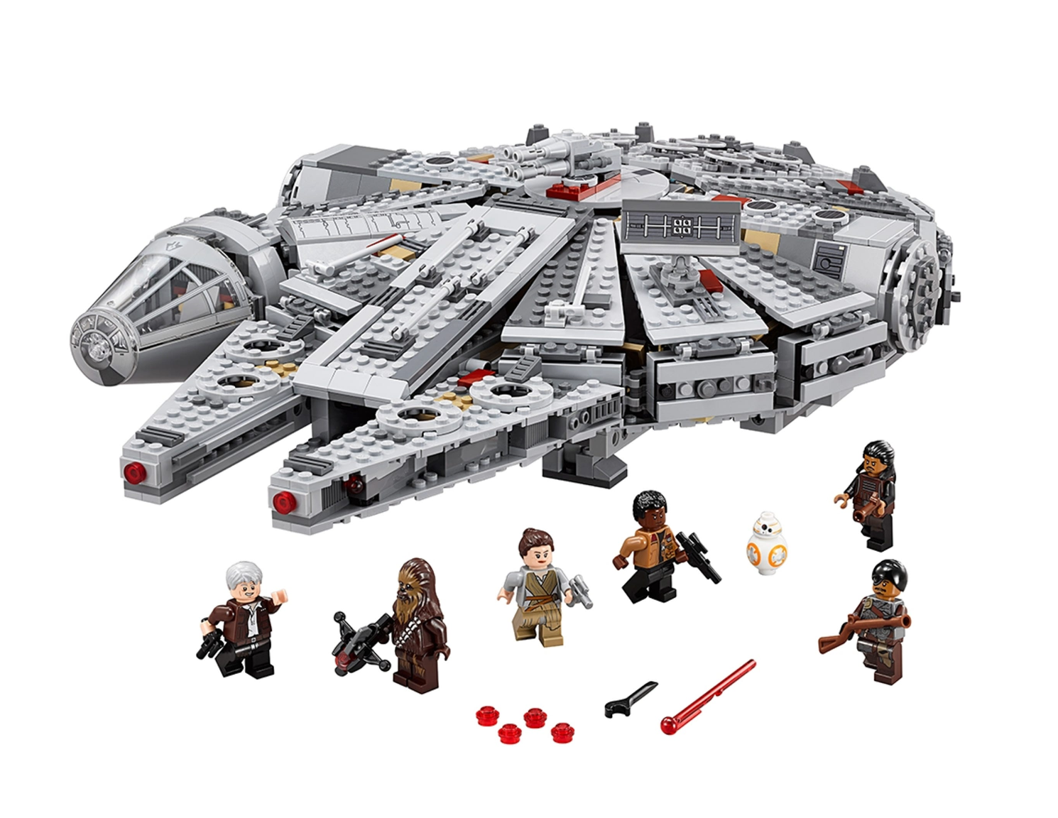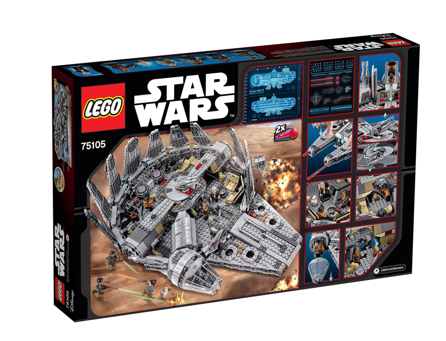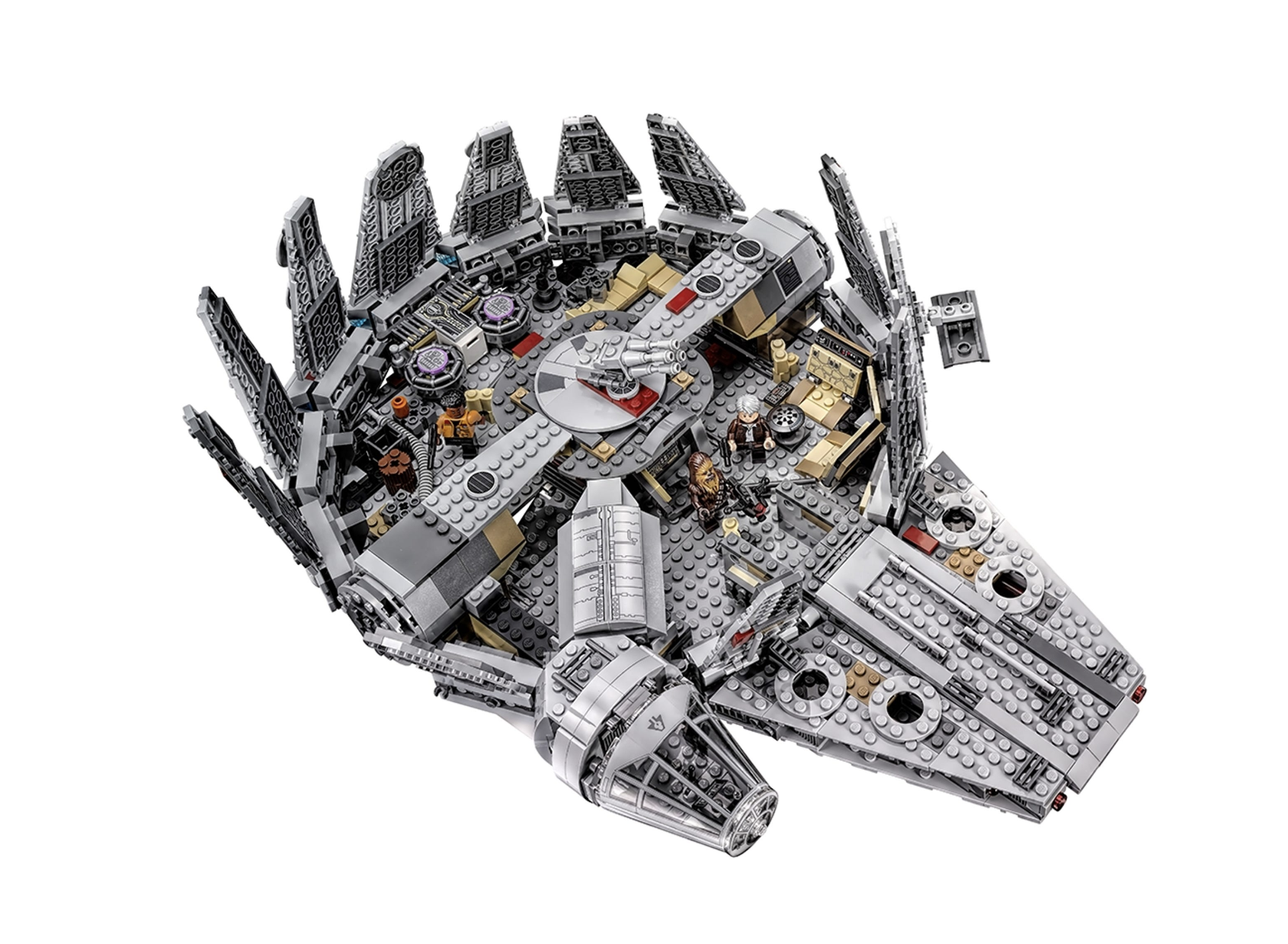 One of the most iconic starships of the Star Wars™ saga is back, and it’s leaner and meaner than ever before! As featured in exciting scenes from Star Wars: The Force Awakens, this latest LEGO® version of the Millennium Falcon™ is crammed with new and updated external features, including an even more streamlined and detailed design, detachable cockpit with space for 2 minifigures, rotating top and bottom laser turrets with hatch and space for a minifigure, dual spring-loaded shooters, sensor dish,ramp and an entrance hatch. Open up the hull plates to reveal even more great new and updated details inside, including the main hold with seating area and holochess board, more detailed hyperdrive, secret compartment, extra boxes and cables, and storage for spring-loaded shooter ammo. And of course no LEGO Millennium Falcon model would be complete without Han Solo and Chewbacca, as well as other great characters from Star Wars: The Force Awakens. Activate the hyperdrive and set course for LEGO Star Wars fun! Includes 6 minifigures with assorted weapons: Rey, Finn, Han Solo, Chewbacca, Tasu Leech and a Kanjiklub Gang Member, plus a BB-8 Astromech Droid.