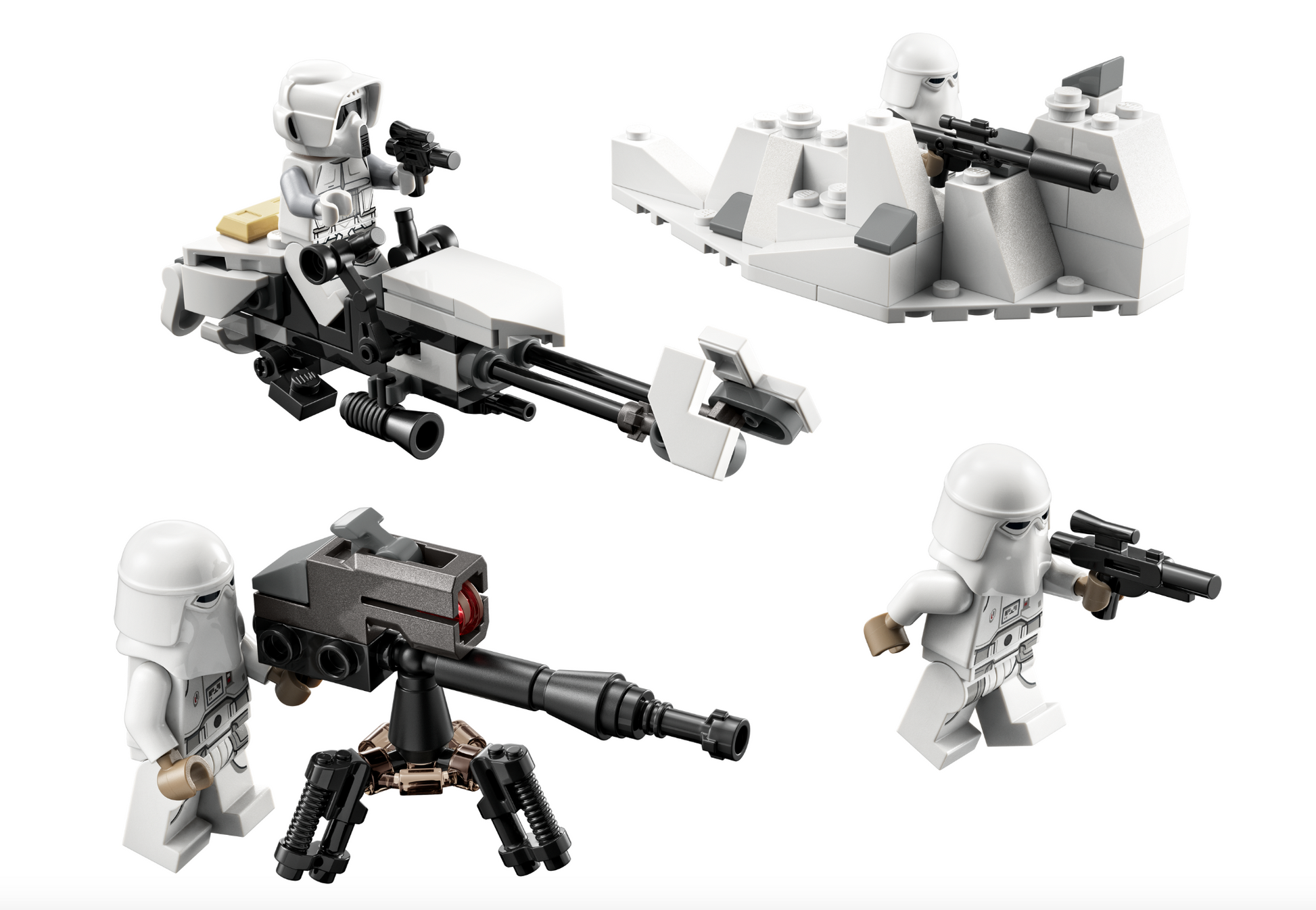 • Mini builds – An Imperial Hoth speeder bike (which also combines with the 75313 AT-AT set), stud-shooting E-Web heavy repeating blaster and a snow trench with extra ammunition