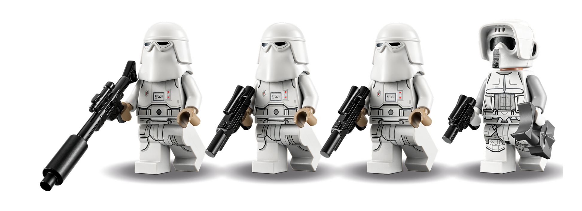 • 4 LEGO® minifigures – A Hoth Scout Trooper and 3 Snowtroopers, plus 2 blaster guns, a blaster rifle and blaster pistol