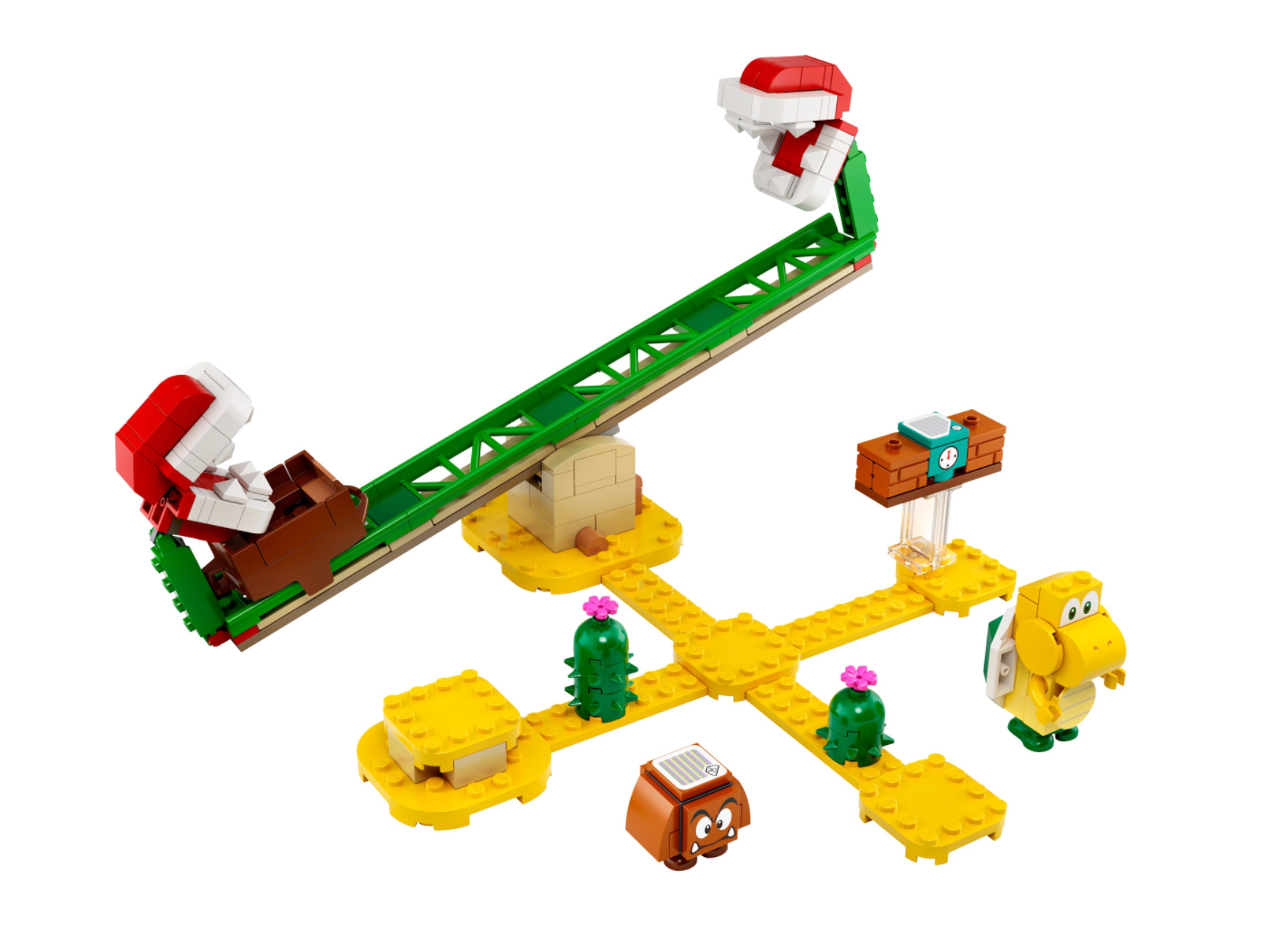 - This collectible toy playset has a buildable seesaw with a platform on rails for LEGO® Mario™ (figure not included) to stand on. Players must seesaw quickly to win coins but stay clear of the Piranha Plants at each end.