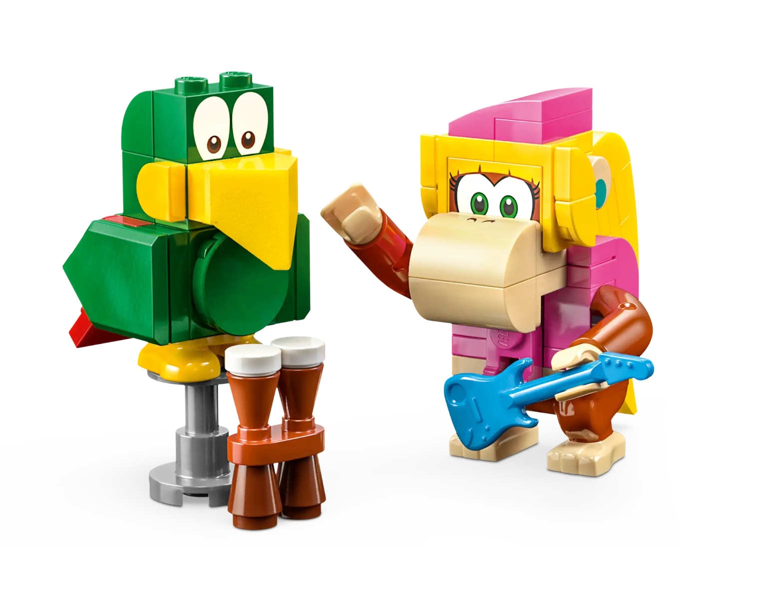 • 2 LEGO® Super Mario™ characters from the jungle home of Donkey Kong™ – Dixie Kong with a guitar element and Squawks the parrot with a buildable microphone, plus buildable bongos and an amplifier